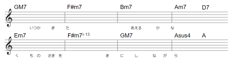 Aメロはコードこそ次々変わりますが、トップノートが固定されているため大きな変化を感じず緩やかに、静かにコードが移り変わる。そんな印象を受けます。