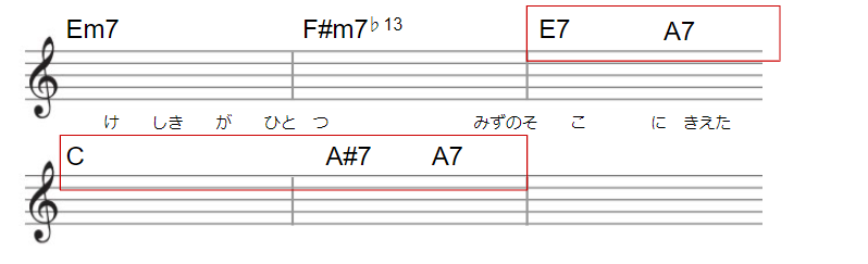 3小節目E7は、Aに向かうセカンダリードミナントとして。