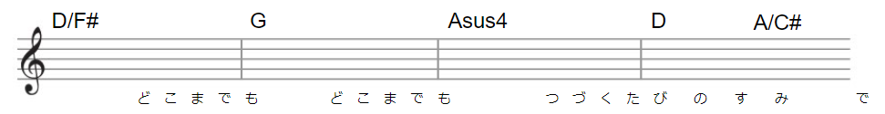Cメロ「どこまでも どこまでも 続く旅の隅で」の部分は歌詞に合わせ、明るく上昇を続けるコード進行になっています。