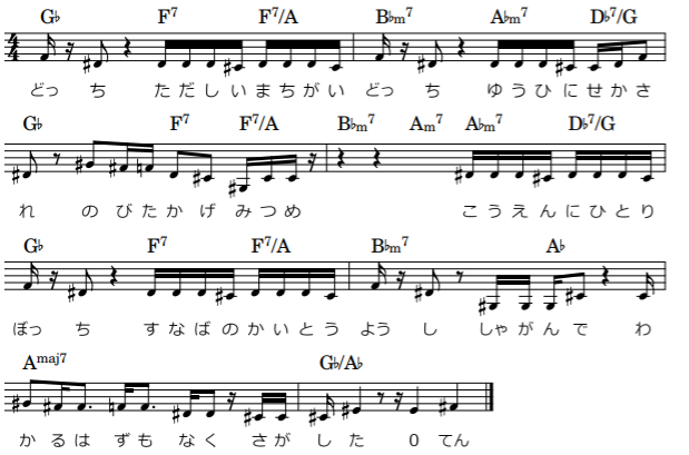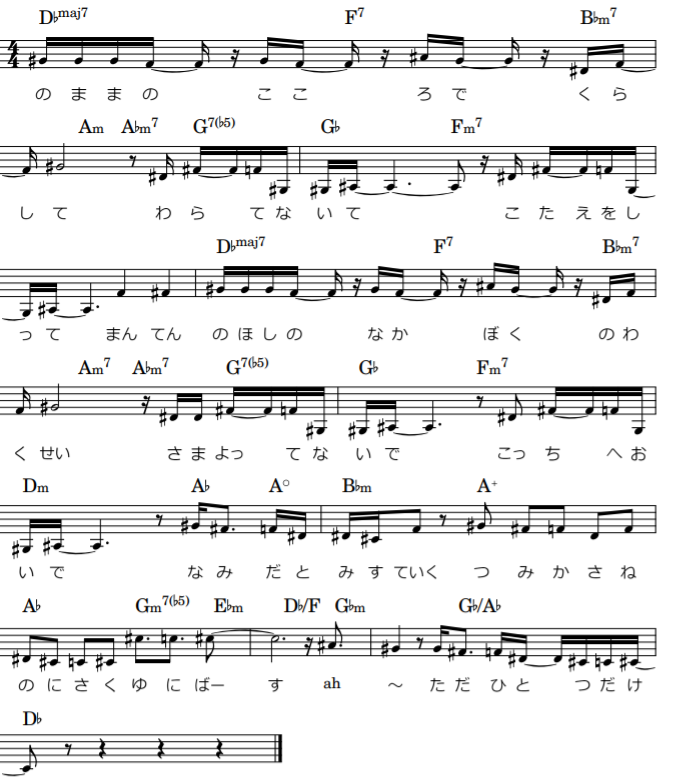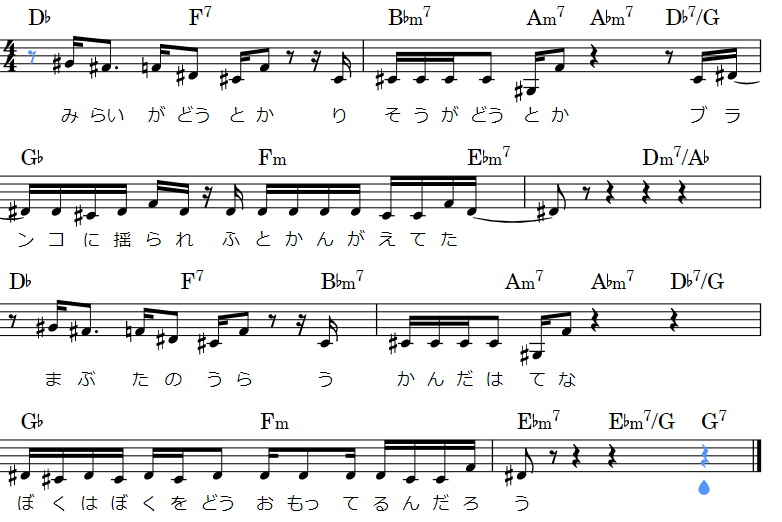 本来コードはA♭m7(Ⅱ)→D♭7(Ⅴ)→G♭(Ⅰ)、トゥーファイブワン進行を意識していますが、D♭の部分が「D♭7/G」に。